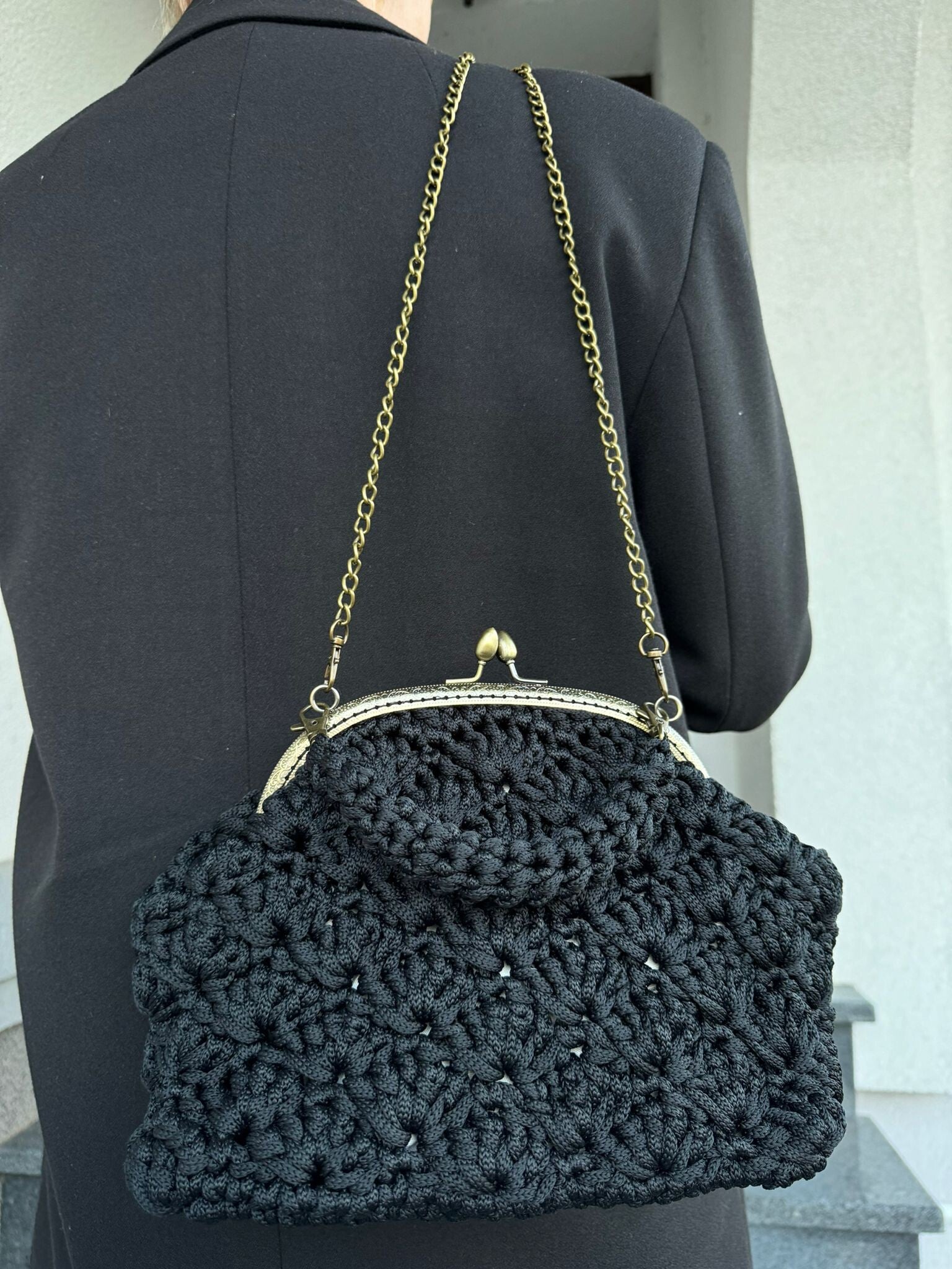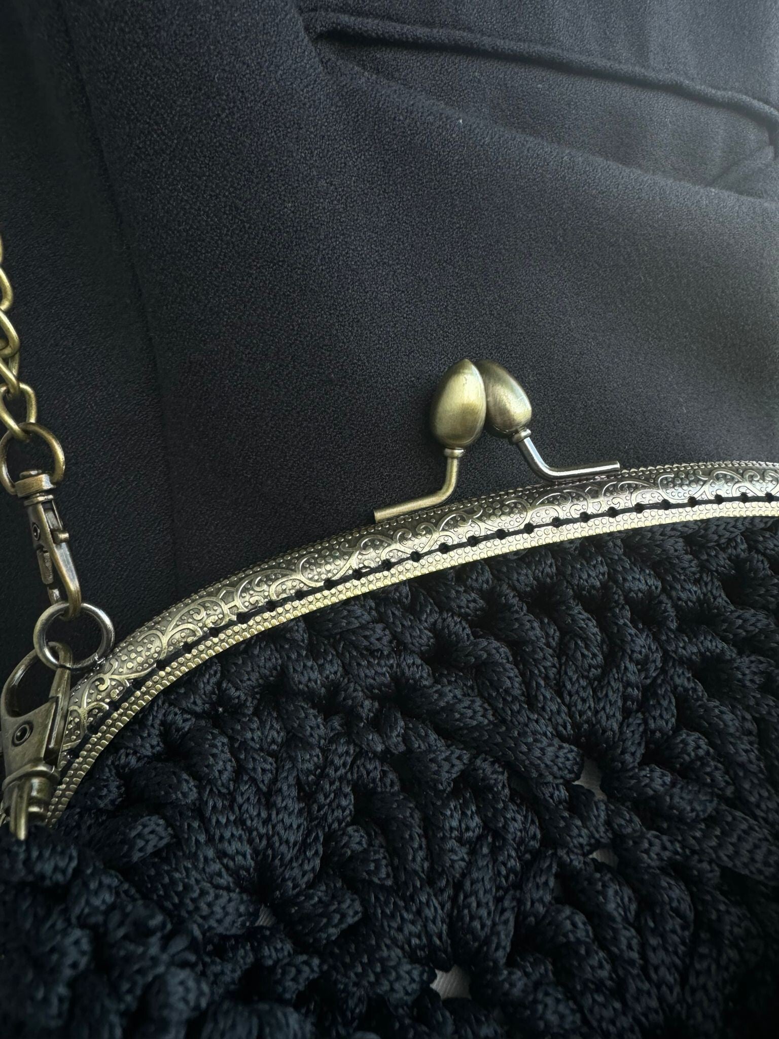 Ręcznie robiona , okrągła torebka ze sznurka z eleganckim zapięciem na bigiel, pomieści najpotrzebniejsze rzeczy które chcesz mieć przy sobie, takie jak telefon, portfel czy chusteczki.